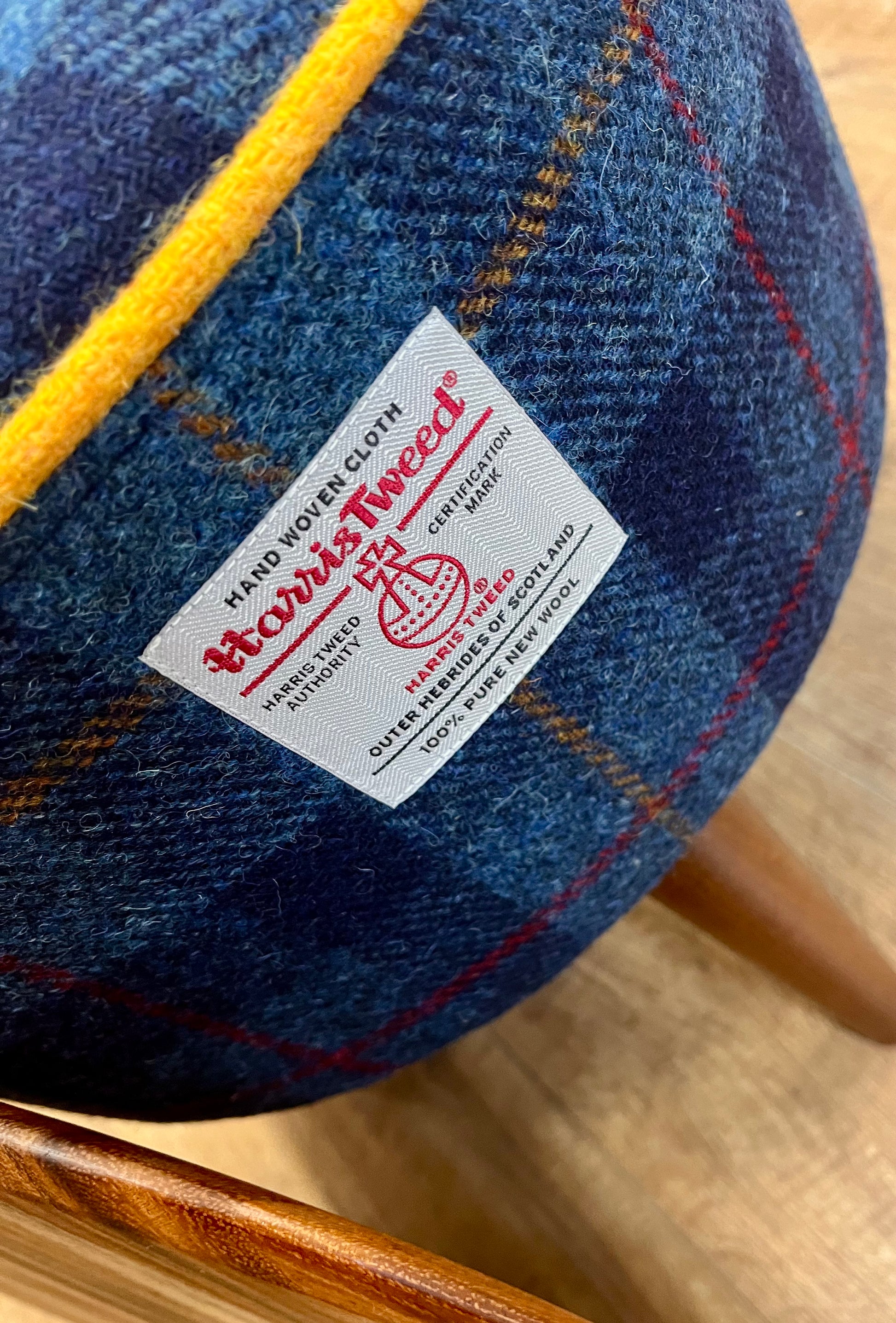 Blue tartan Harris tweed end table with Yellow piping and removable rustic style wooden top.
