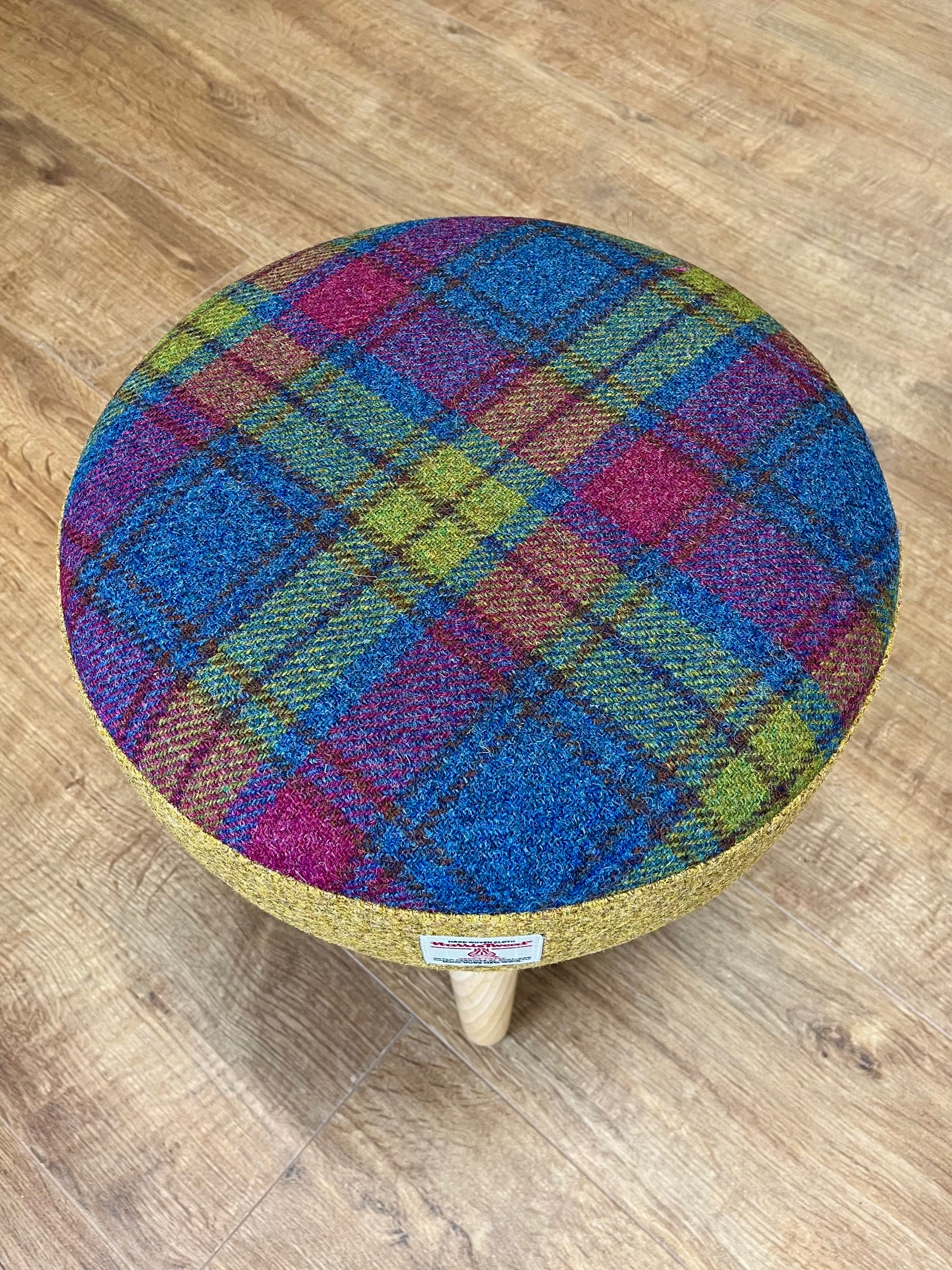 Mustard and Colourful Tartan Harris Tweed Footstool with Varnished Light Wooden Legs