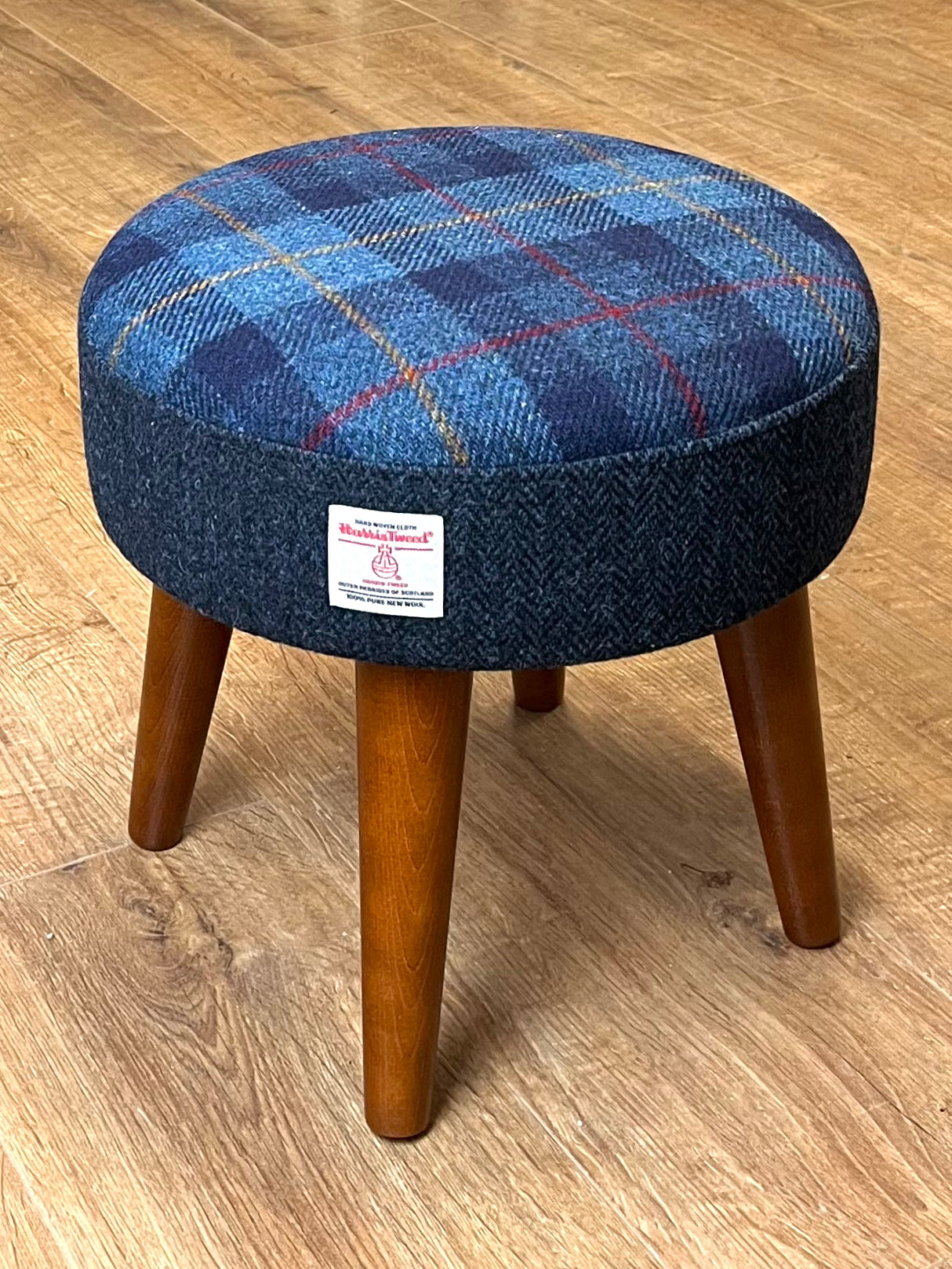 Small Tartan and Navy Blue Herringbone Harris Tweed Footstool