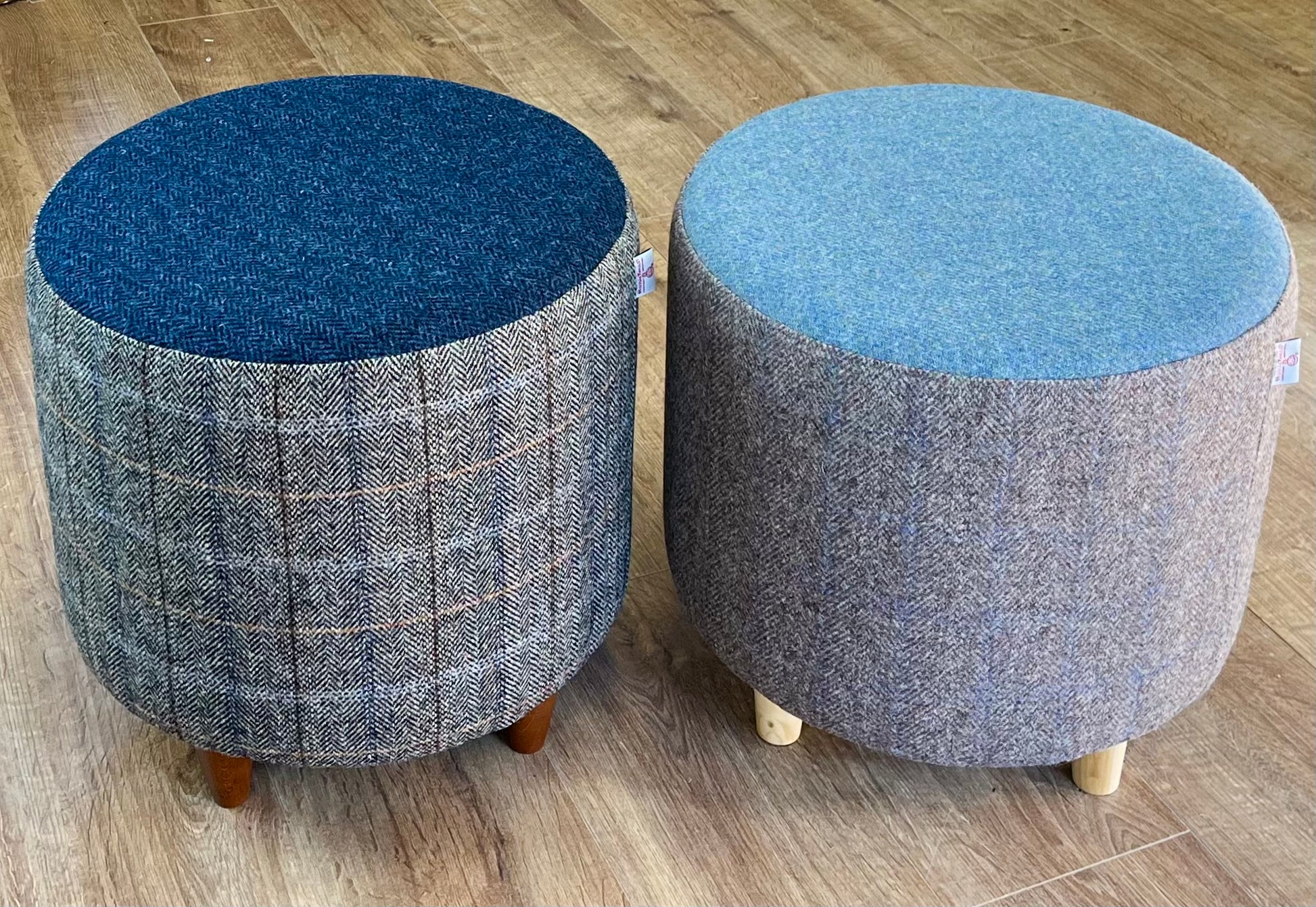 Taupe and light Blue Overcheck Footstool with Light Blue Harris tweed chunky footstool.